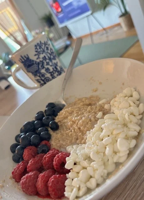 Meikäläisen aamupala oli vuosikausia joka aamu pari palaa ruisleipää ja siinä päällä paistettu muna puoliksi…ja tietysti se kahvi. Kohta tulee vuosi siitä, kun aloin syömään enemmän puuroa aloitettuani Jessica Reimanin Koodi-valmennuksessa. Valmennus oli ja meni, mutta puuro jäi 😍 Tätä satsia syön nyt aamupalaksi enimmäkseen, tosin se munaleipä löytää tiensä aamiaispöytään myös pari kertaa viikossa. Puurona minulla on Elovenan annospikapuuro maussa Kaura & Kuitu, en tykkää niistä muista (makupuuroista). Puurooni tulee aina teelusikallinen maapähkinävoita, läjä raejuustoa, sekä vadelmia - joskus vadelmat saavat seuraansa myös mustikoita 🫐 Sama aamupala kulkee toimistopäivinä helposti mukana, ja syön sitten sen siellä työpöytäni ääressä. Aloitan päiväni viimeistään kahdeksalta toimistopäivinä, ja kotikonttorilla seitsemän ja puoli kahdeksan välillä - mutta aamupalaa en koskaan syö ennen kahdeksaa.